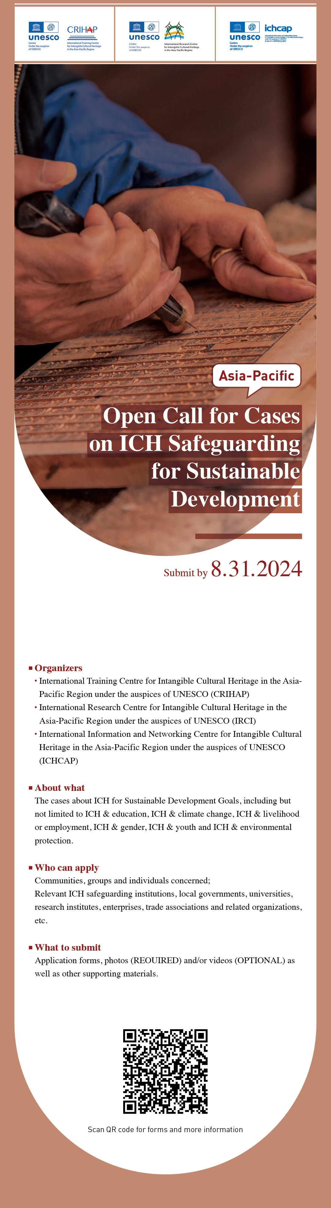The International Training Centre for Intangible Cultural Heritage in the Asia-Pacific Region under the auspices of UNESCO (CRIHAP) is inviting interested institutions and individuals to submit cases of programmes, activities, projects, and other practices carried out by them in their effort to promote sustainable development through ICH safeguarding. The case collection will be framed around the theme of ICH Promoting Sustainable Development, with sub-themes including but not limited to ICH&education, ICH&climate change, ICH&livelihood or employment, ICH&gender, ICH&youth and ICH&environmental protection. IRCI is supporting this call with the expectation that it will provide valuable resources for investigating issues relating to ICH and sustainable development.